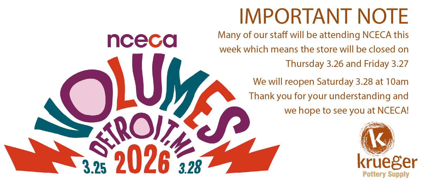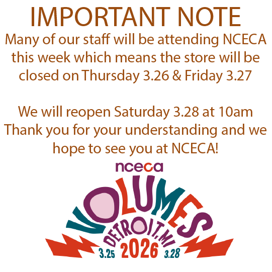 IMPORTANT NOTEMany of our staff will be attending NCECA this week which means the store will be closed on Thursday 3.26 and Friday 3.27. We will reopen Saturday 3.28 at 10amThank you for your understanding and we hope to see you at NCECA!
