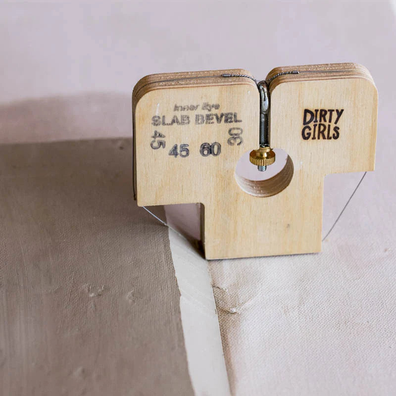 This is the ultimate handbuilding tool. It is basically 3 tools in one. You get 3 different angles with which you can bevel your slabs for construction. Place the tool flat on the table up against your slab and draw it along the slab to cut a perfect angle for construction. you get 30, 60, or 45 degree cuts. The taut wire never snags or causes drag or deformation on your slab. You can quickly and easily tighten or replace the wire too!